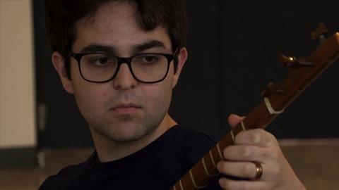 Composer Kian Ravaei playing the setār, a traditional Persian plucked string instrument